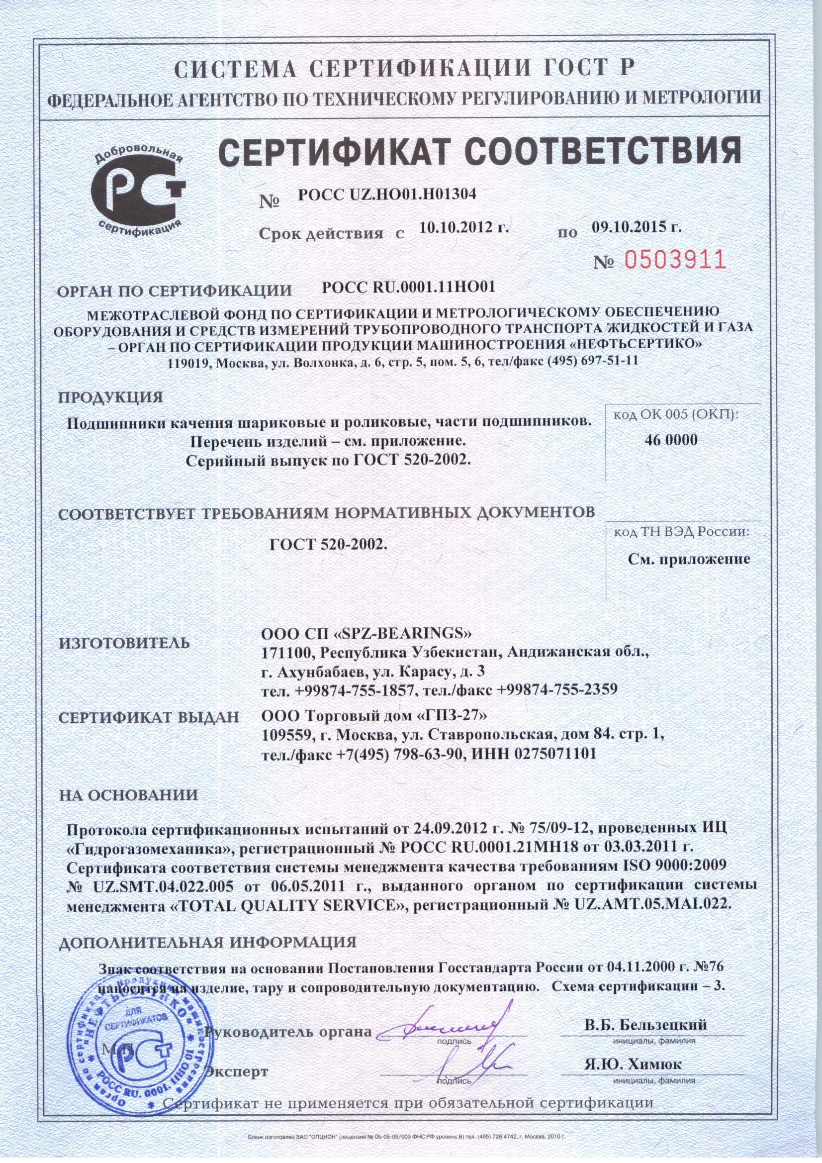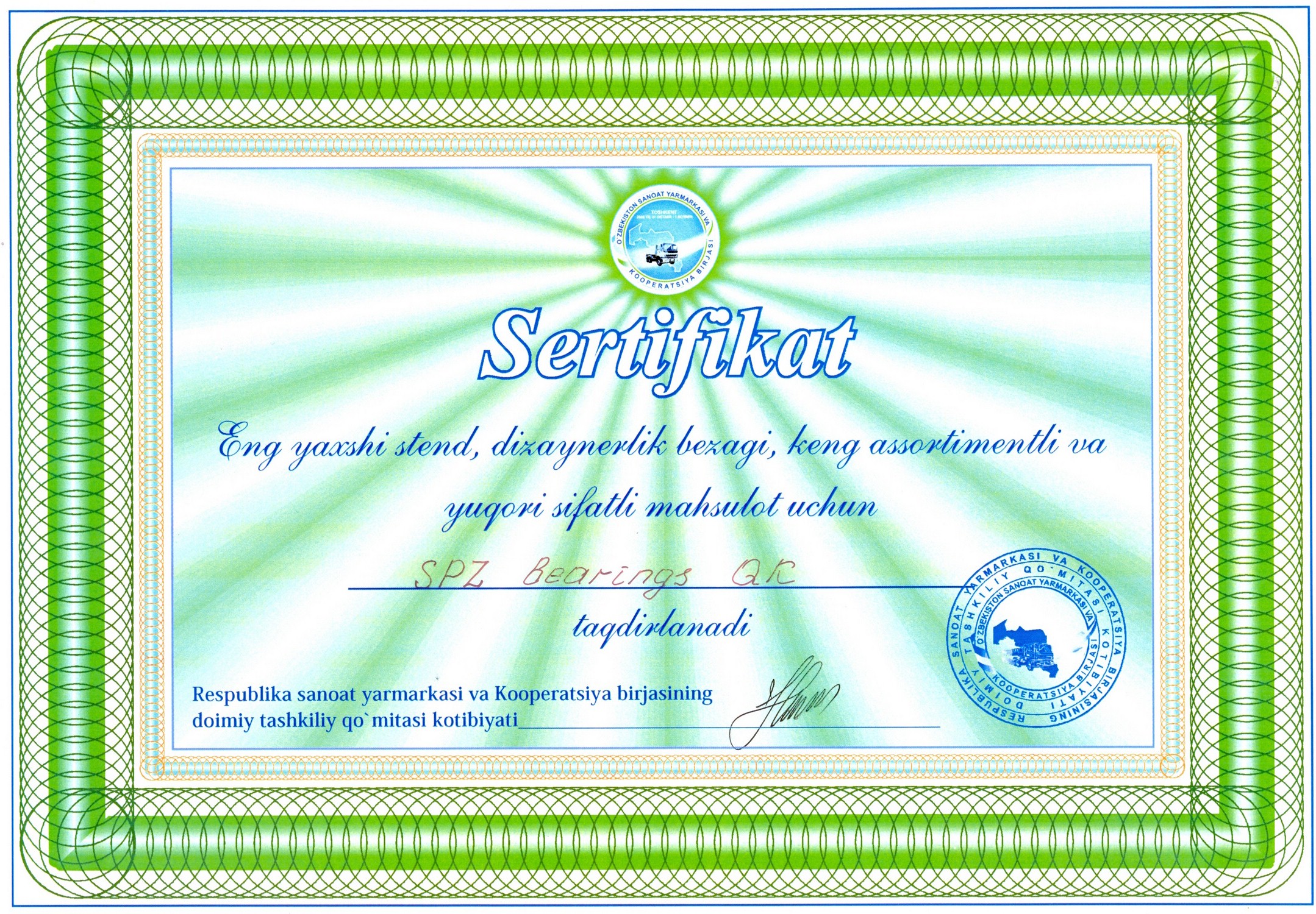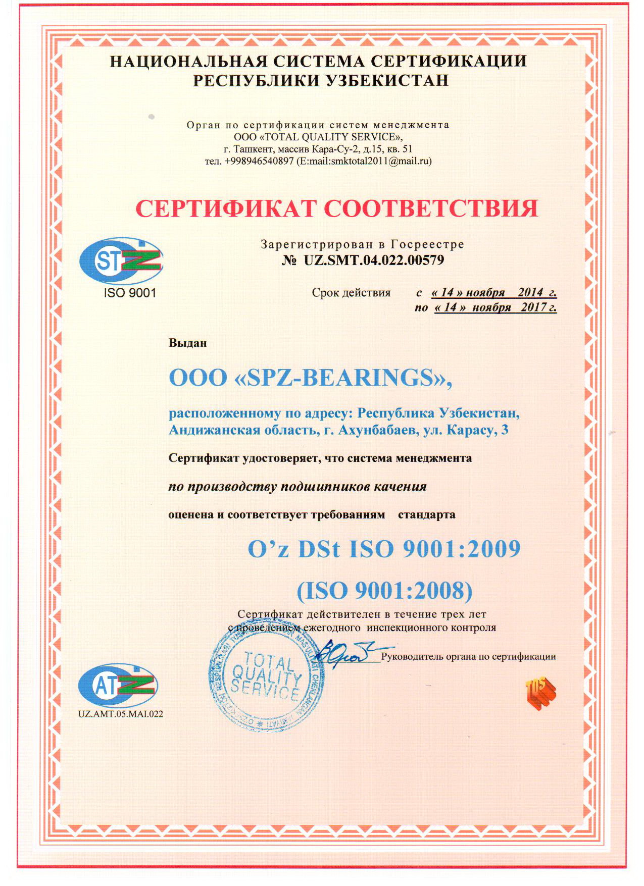 Все подшипники компании имеют сертификат соответствия федерального агентства по техническому регулированию и метрологии Российской Федерации и Национальной системы сертификации республики Узбекистан, а также другие необходимые сертификаты соответствия Госстандарта Республики Узбекистан и гигиенические удостоверения. Инженерно-технические работники предприятия, изучая спрос потребителей, ведут постоянную работу по расширению номенклатуры продукции завода.